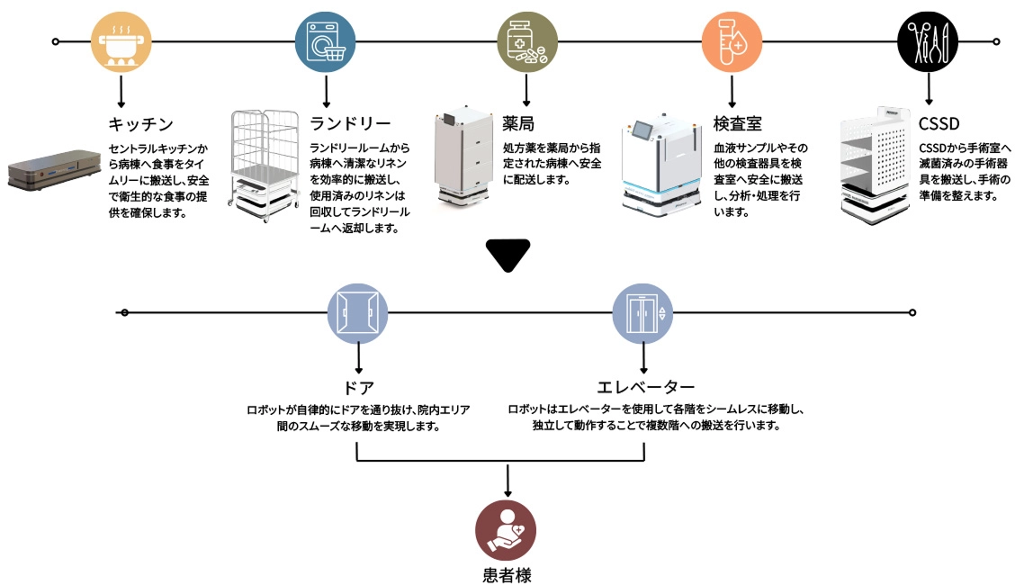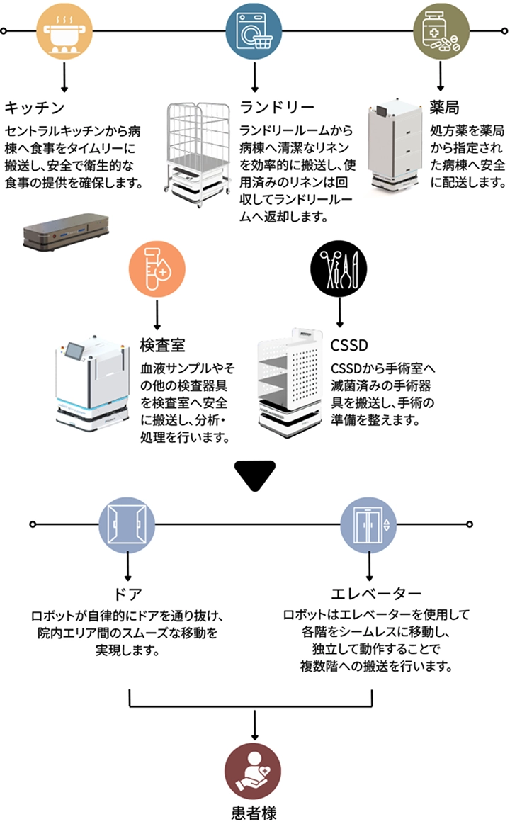 SESTO ROBOTICSは、食事、リネン、手術器具、検査サンプル、その他の消耗品の定期的または臨時の配送を信頼性高く自動化し、医療提供者が質の高いサービスを提供できるようにします。